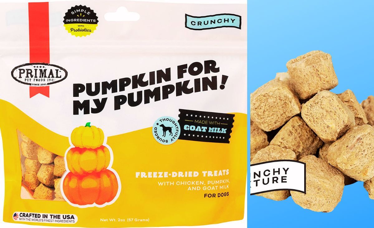 Make your pup smile and let them know how much you care with PRIMAL PET FOODS Freeze Dried Chicken & Pumpkin Dog Treats with Goat Milk!