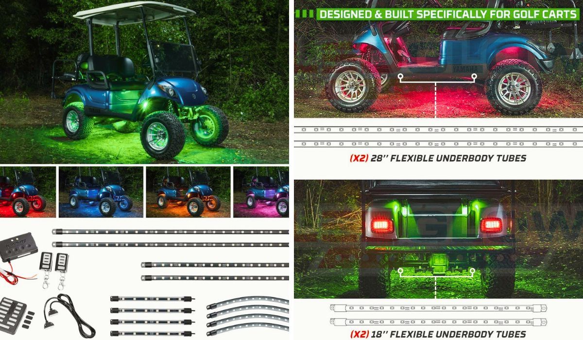 The kit includes two 28" tubes, two 18" tubes, four 12" wheel well tubes, and four 8" interior tubes all equipped with a total of 180 premium SMD LEDs to really light up your golf cart.