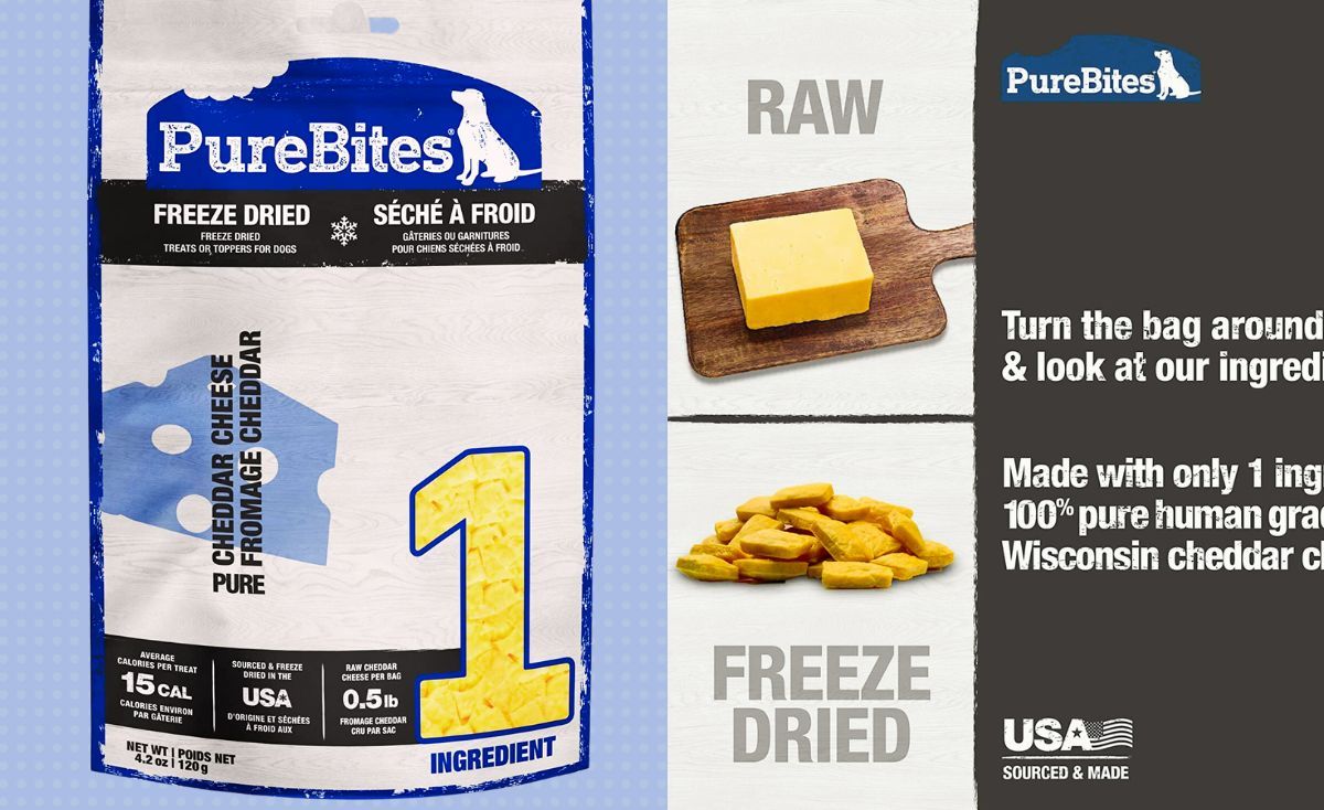 You bark, we listen! If your pup has a taste for cheddar cheese, PureBites Freeze-Dried Cheddar Cheese Dog Treats are the answer! These treats are made in the USA with nothing but 100% pure Wisconsin cheddar - no fillers, sweeteners, or funky stuff here just fresh raw whole food cheese!