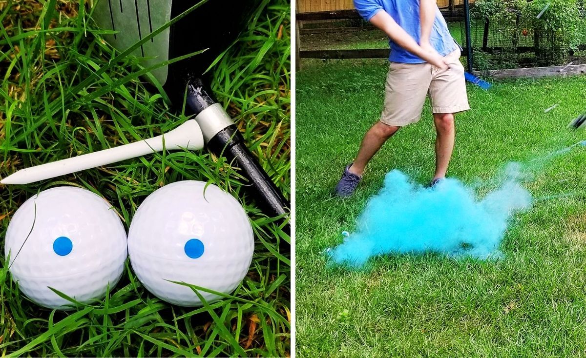 Upon impact with a golf club, the ball bursts open and releases a cloud of colored powder or liquid, revealing the true gender to the excited parents-to-be and their loved ones. These golf balls have been growing in popularity as a fun way to share the excitement of a new baby's gender with friends and family.