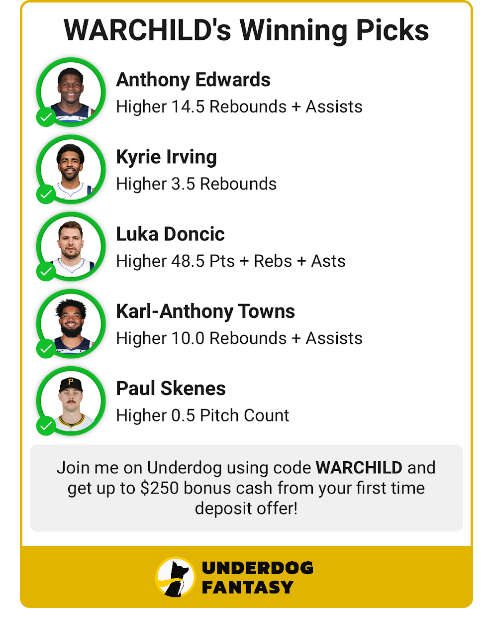 Join me on Underdog using code WARCHILD and get up to $250 bonus cash from your first-time deposit offer.