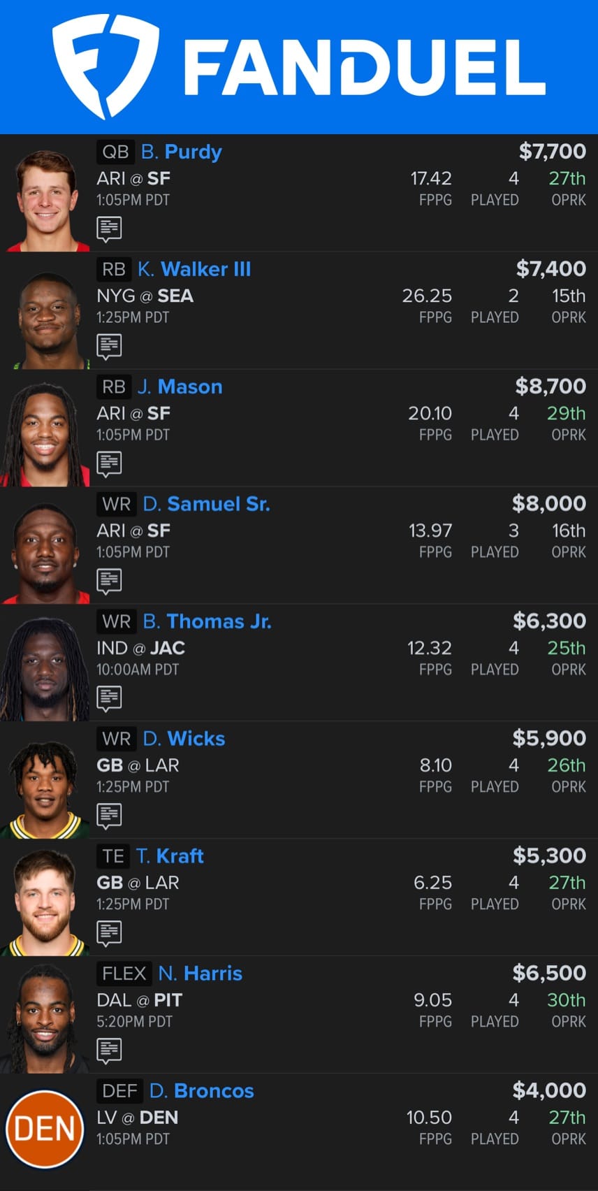 Did you play this on our site? 6 man that turned 5 man bc NIco got hurt which sucked bc he was at 79 Yards in the first quarter so should have been a 6 man-winner.