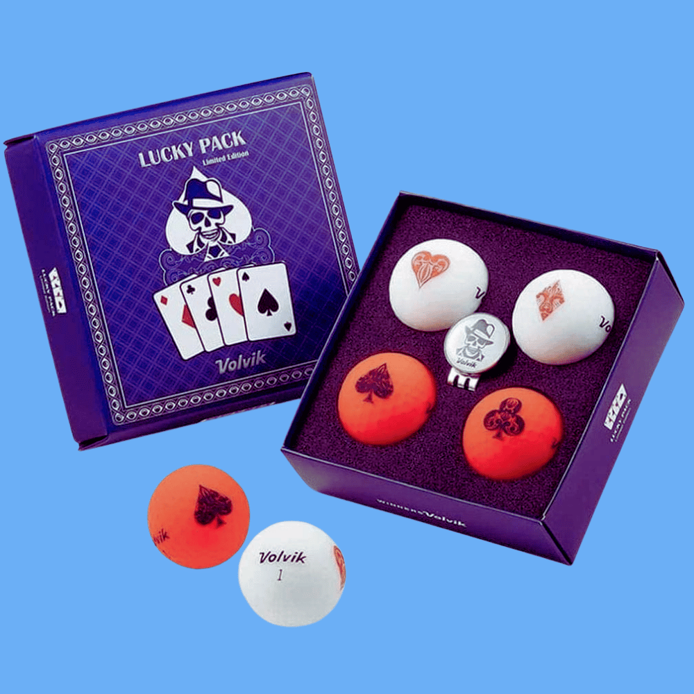 The Volvik Vivid Lucky Pack is the perfect golf kit for anyone who enjoys having an edge on their game. These three custom balls feature Volvik's new matte finish, you'll gain improved control and better overall performance, making even par look like a breeze. This limited edition pack comes with a white and red matte finish ball each decorated to show the four card suits – complete your own royal flush when you hit the course!