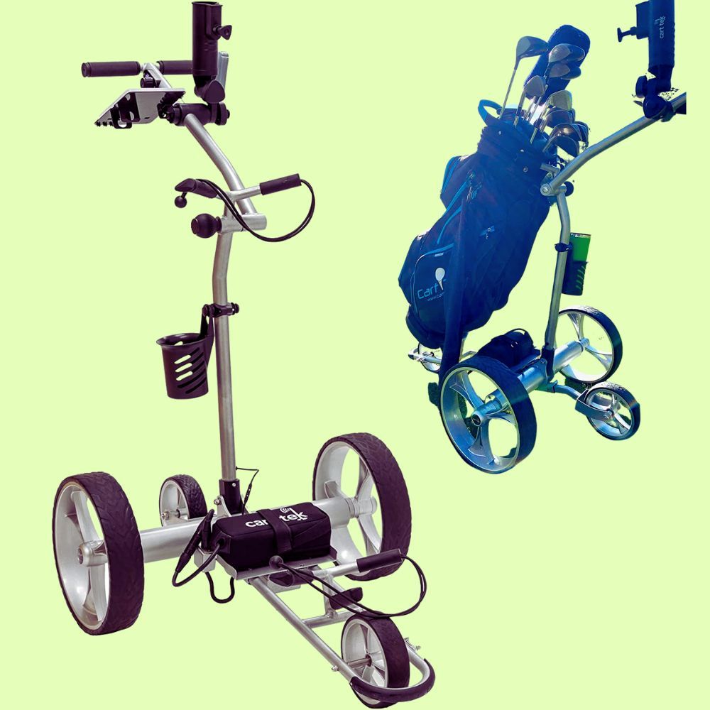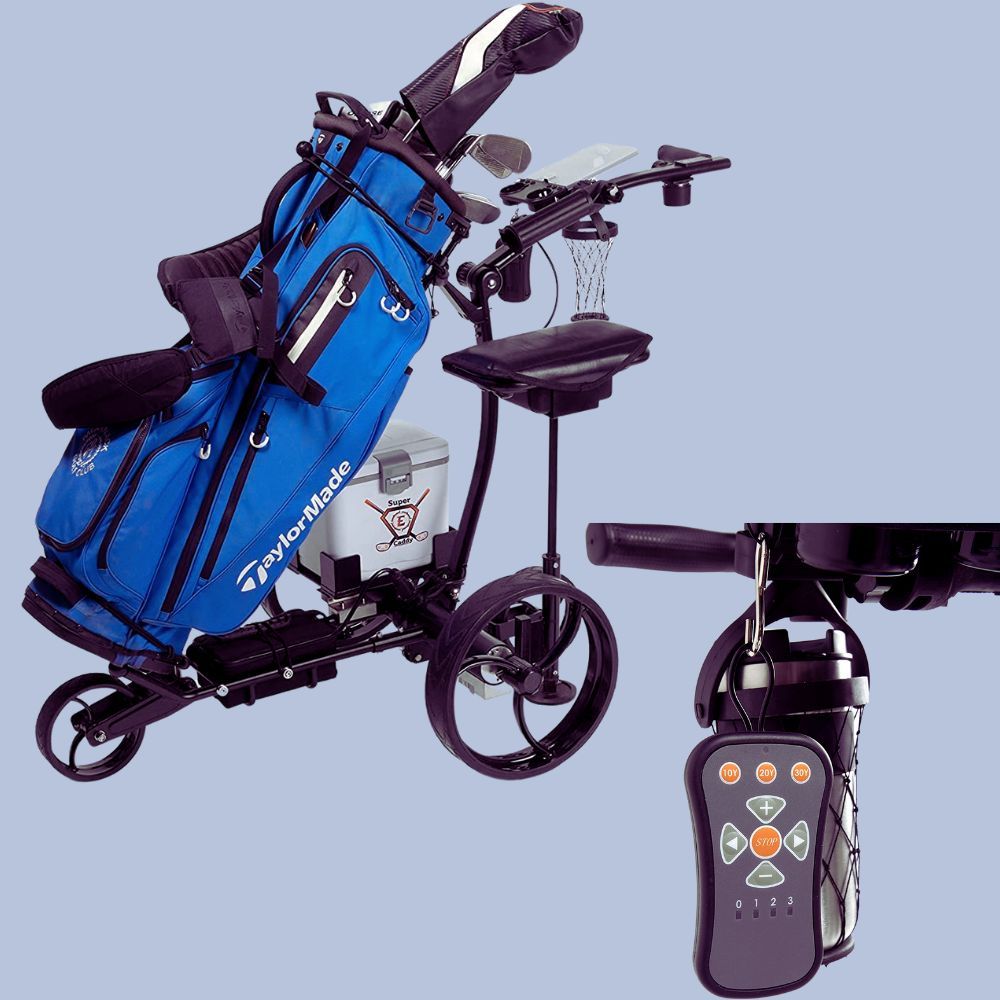And when you're done playing, their rear wheels can be inverted to reduce the footprint size by more than 25%. With an overall weight of 28.6 lbs with no battery and 35 lbs with the battery, this electric golf cart not only helps you get around the course but also fits easily in a small area. The remote control is very easy to use.