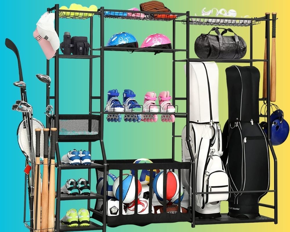 Mythinglogic is the ideal golf equipment organizer for all your golfing needs! Our extra large design fits 2 standard golf bags or 1 large size, with 3 extra medium shelves, a golf club storage stand, and 4 removable hooks. Keep your equipment organized and in one place, no need to worry about where to store your clubs.